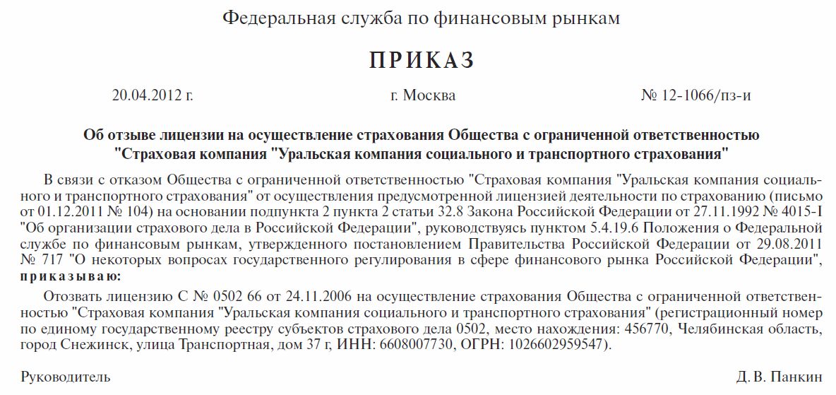 Приказ об отзыве лицензии СК "Уральская компания социального и транспортного страхования"