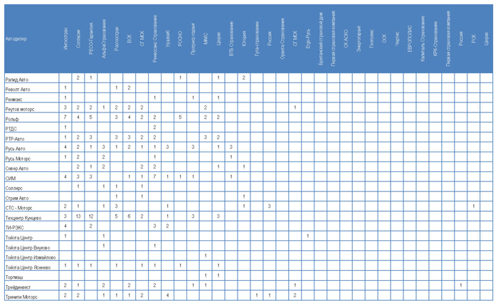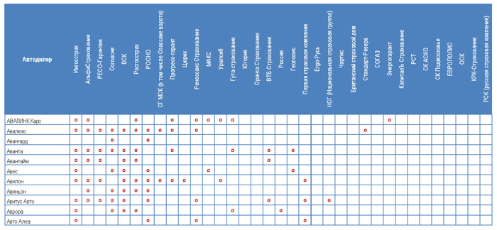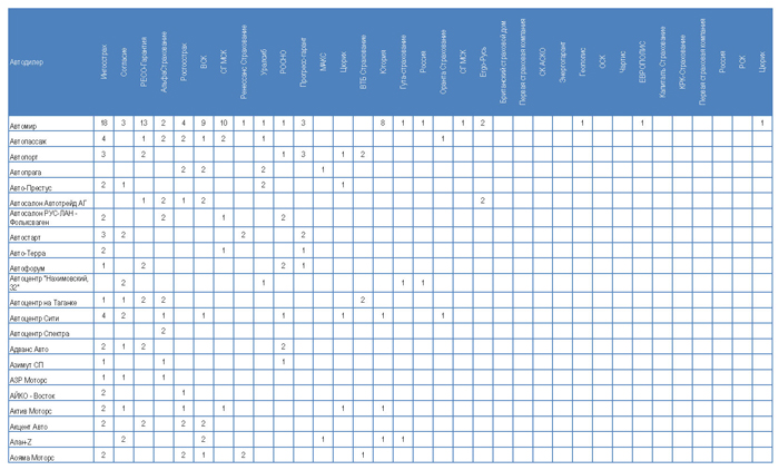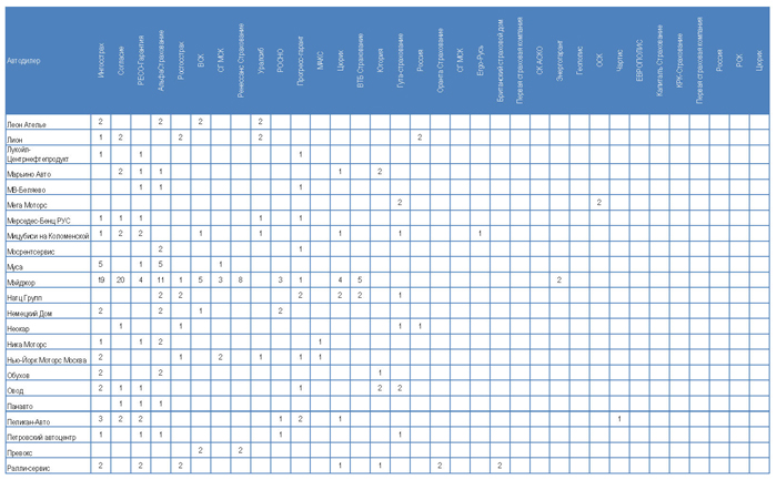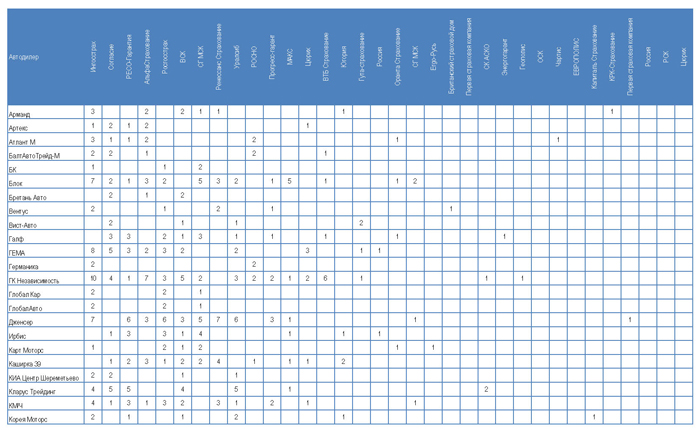 Одна из задач исследования — получить перечень страховых компаний, работающих с автосалонами. В ходе интервью специалисты по автострахованию говорили, что работают с 10-15 страховыми компаниями. Называли в качестве своих партнеров не более 10, а делали предварительный расчет по программам каско лишь для 2-4 компаний. В Таблице 1 приводятся сводные данные по автодилерам в целом: какие страховые компании в ходе исследования были названы в качестве партнеров менеджерами по автострахованию.