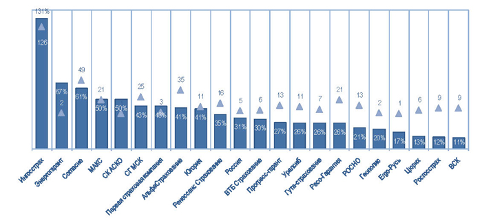 Незначительно изменились позиции компаний по количеству предложений. Лидирует, как и прежде Ингосстрах с явным преимуществом над остальными компаниями. Но есть исключения: значительно увеличилось количество предложений Росгосстраха и Ренессанс Страхования. Причем, у последней компании на фоне ухудшения показателя представленности.