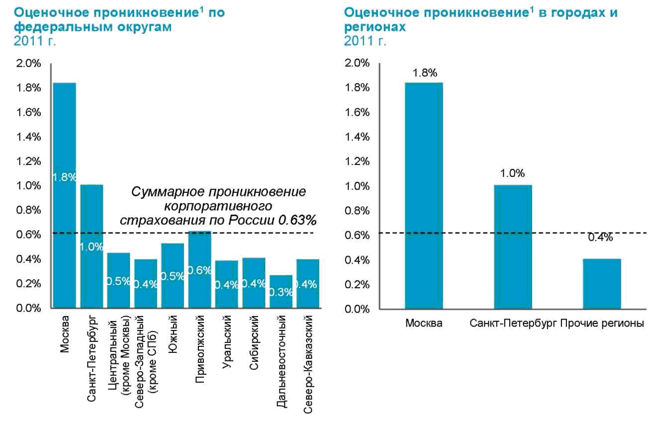 1. Региональный уровень проникновения рассчитывался как отношение начисленной премии в соответствующем регионе за 2011 г. к прогнозу Валового Регионального Продукта (ВРП) за этот же период. Прогноз ВРП рассчитывался исходя из предположения, что ВРП растет с тем же темпом, что и суммарный ВВП