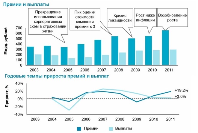 - В 2011 г., страховые выплаты в сегменте ОМС составили 587 млрд. рублей (97% от собранных премий) против 278 млрд. рублей (96% от собранных премий) в 2007 г. В рисковом сегменте, рост выплат опередил рост премий. Объем выплат составил 304 млрд. рублей (46% от собранных премий) в 2011 г. и 204 млрд. рублей (42% от собранных премий) в 2007 г.