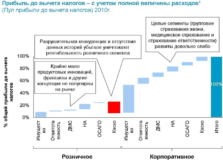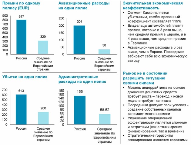 В то же время преобладание андеррайтинга на основе движения денежных средств и зависимость от посредников в продажах исказили конкурентную среду в некоторых сегментах рынка. Страхователи платят премии в несколько раз выше тех, что платят в других странах, страховщики работают в убыток, а всю прибыль забирают посредники. Без реформы регулирования ситуация на рынке вряд ли изменится по причине его инертности.