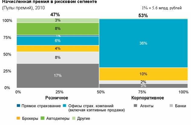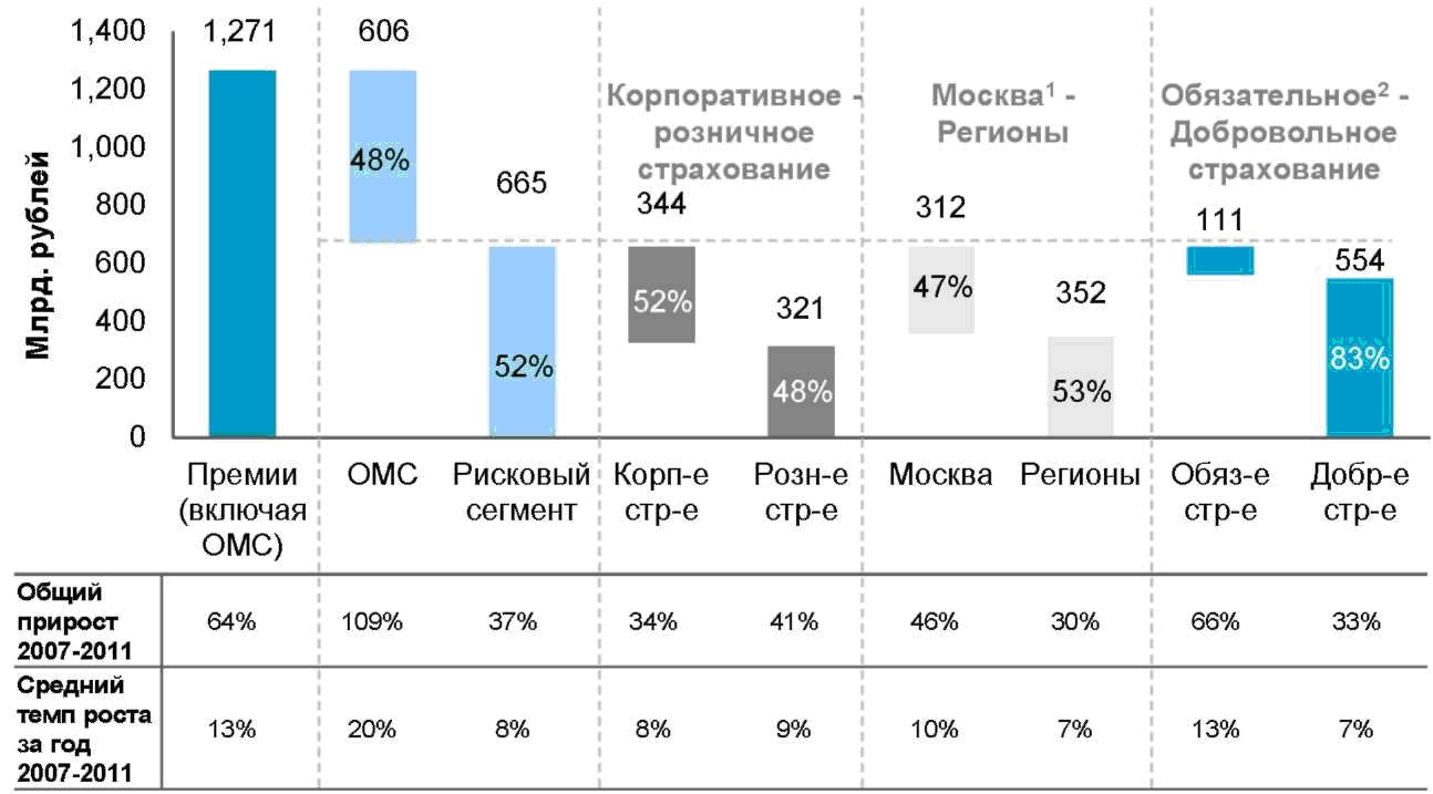 После потрясений в 2008-2009 гг., вызванных мировым финансовым кризисом, рынок страхования вернулся к уверенному, двухзначному росту, существенно превышающему темп инфляции. К концу 2011 г. объем премий на рынке составил 1 271 млрд. рублей. Из них 606 млрд. рублей приходятся на сегмент обязательного медицинского страхования (ОМС), в котором страховщики исполняют важную роль администраторов, но не являются андеррайтерами медицинских рисков. Остальные 665 млрд. рублей - премии, собираемые по видам страхования, в которых страховщики осуществляют классический андеррайтинг рисков, и представляющие собой ядро страхового рынка. Премии по этим видам примерно одинаково разделяются на премии по корпоративным и розничным видам страхования (51.7% и 48.3%, соответственно), а также одинаково - на премии, собираемые в Москве (включая Московскую область) и в остальных регионах России (50,3% и 49,7%, соответственно. Доля Москвы без учета Московской области составляет 47,1%