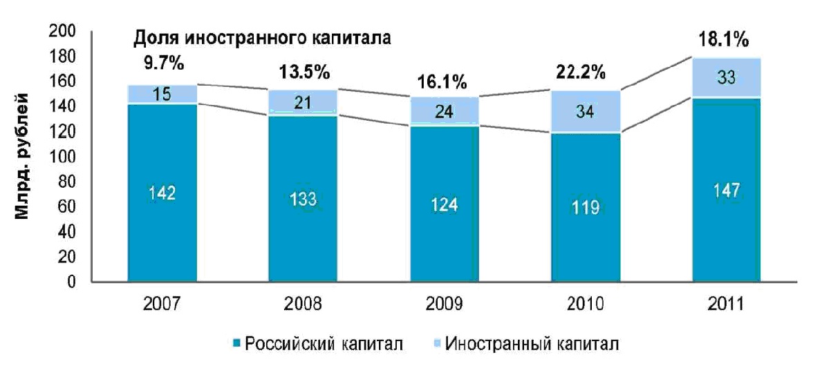 - Общий объем уставного капитала рынка увеличился с 158 млрд. рублей в 2007 г. до 180 млрд. рублей в 2011 г. За это время доля иностранного капитала в совокупном капитале страховых компаний увеличилась с 9,7% до 18,1%