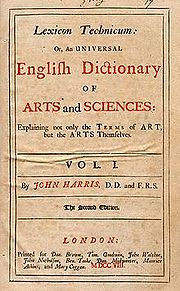 Наиболее распространённый в наше время алфавитный порядок, по-видимому, впервые применил Джон Харрис в энциклопедии Лексикон Техникум. Сам Ньютон опубликовал во втором томе Лексикона, вышедшем в 1710 г. свою единственную статью по химии. Энциклопедия Харриса была, в основном, посвящена науке, но в том понимании, которое существовало на начало XVIII в., и которое в наше время назвали бы наукой и технологией. Тем не менее, значительное количество статей касалось гуманитарных наук, изобразительного искусства, законодательства, коммерции, музыки и геральдики. Сравнительно небольшой по объёму, около 1200 страниц, Лексикон можно назвать скорее энциклопедическим словарём, чем энциклопедией в современном смысле этого слова. Сам Харрис считал его словарём; действительно, это один из первых технических словарей всех времён и народов.